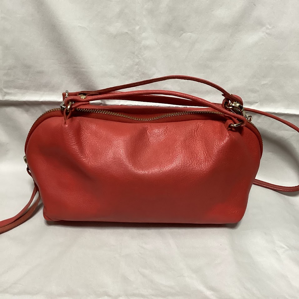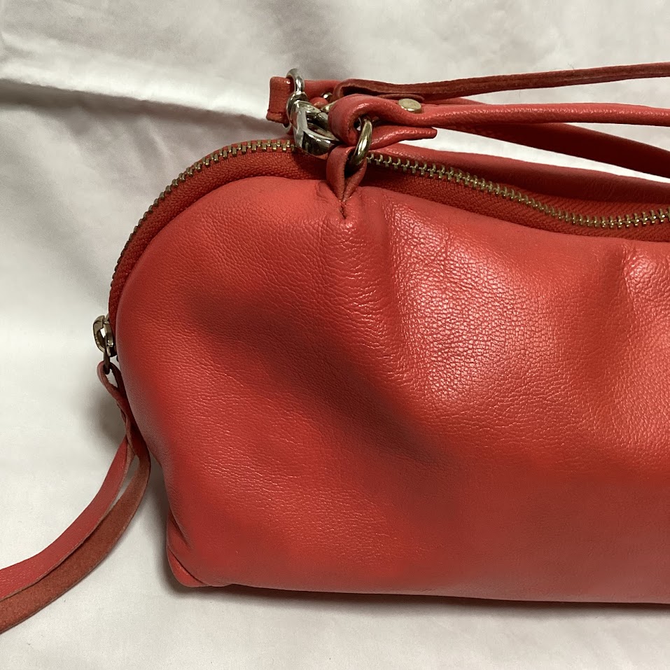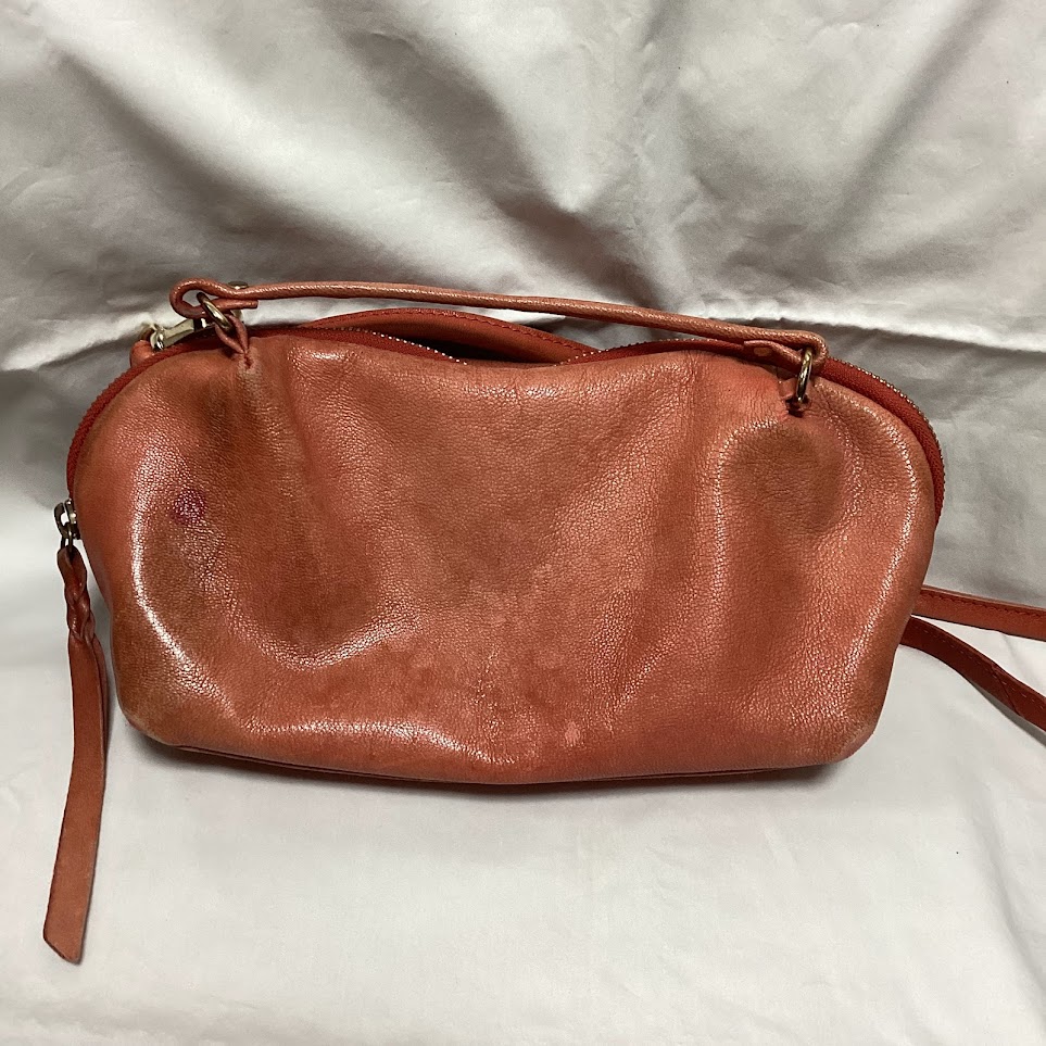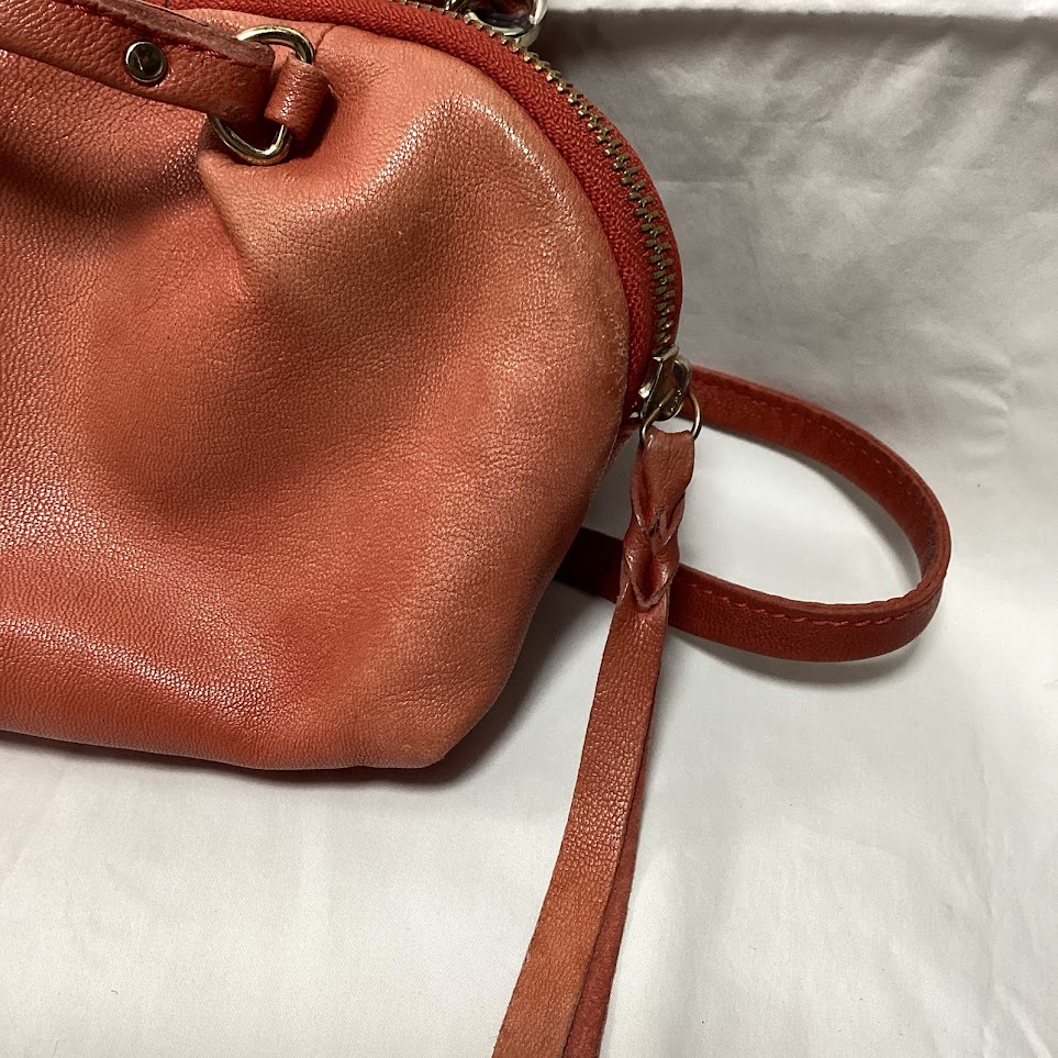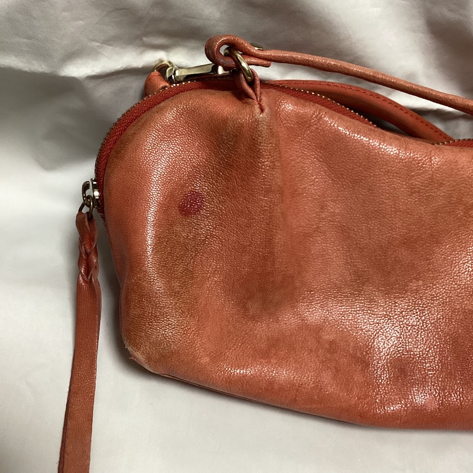 今回は、全体的色が褪せてしまったショルダーバッグの補色のご依頼。元のサーモンピンクカラーは色褪せで褐色になり、部分的に雨による水染みも目立ちます。